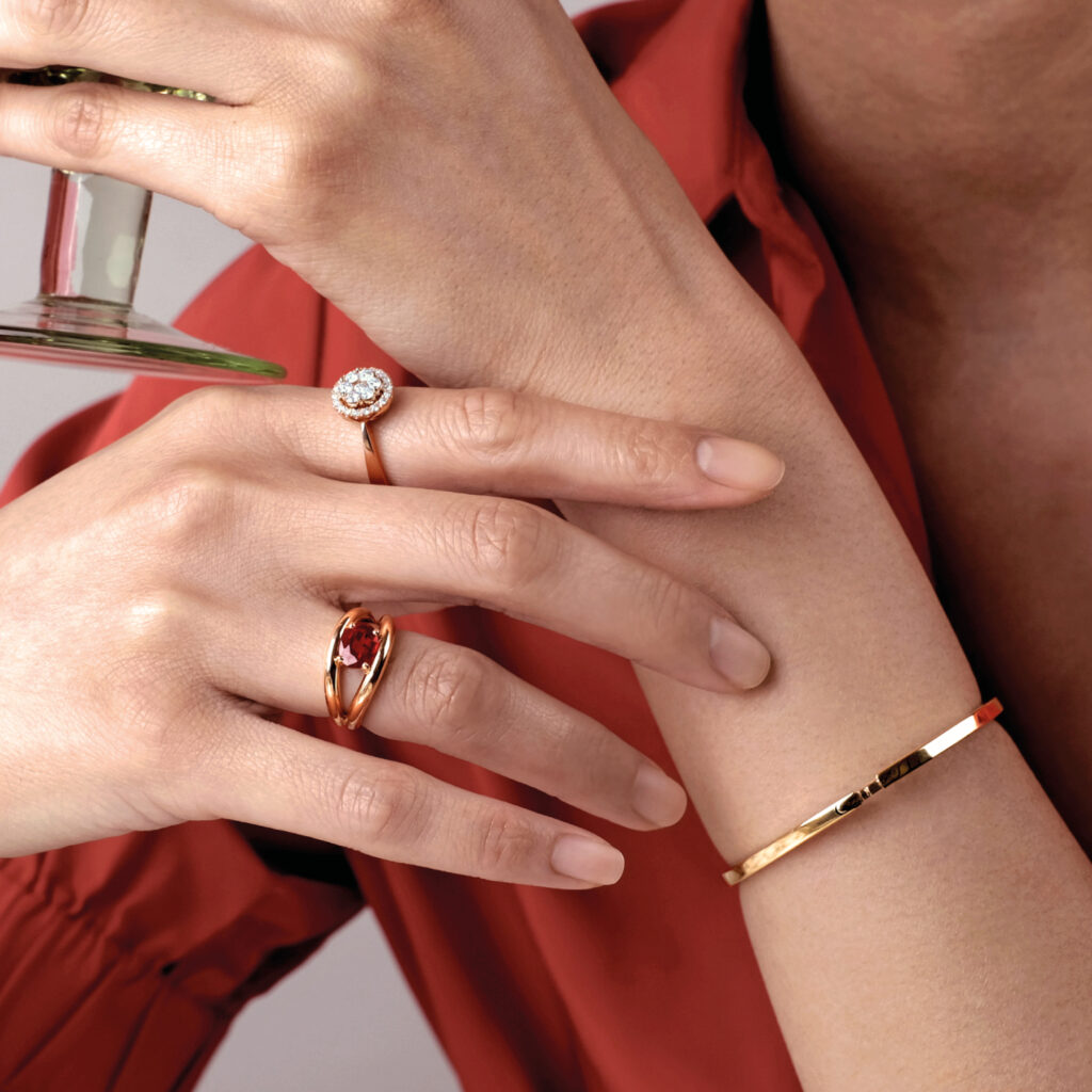 Spectaculaire grâce à la pierre centrale « croquée » entre deux fils d’or ronds, la bague Boccadilupo sublime les pierres de couleur et les diamants.