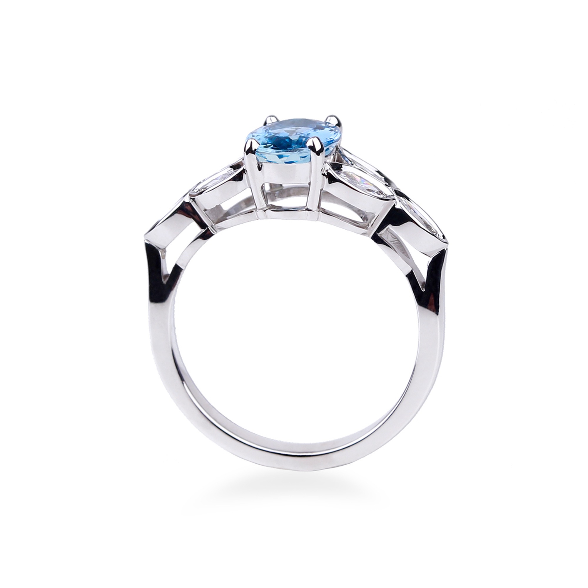 Si la pureté représente l’âme de l’aigue-marine, sa couleur en est la voix. Aujourd’hui, la nuance la plus prisée est le bleu profond, fruit d’une concentration plus importante de fer dans la pierre. Depuis des décennies, les gisements de Santa Maria Itabira, au Brésil, fournissent des cristaux dont le bleu intense a acquis le statut de référence mondiale. Ces pierres rares, nommées Santa Maria pour honorer leur lieu d’origine, se raréfient au fil du temps. Depuis les années 1990, le Mozambique et Madagascar viennent compléter cette palette en proposant des « Santa Maria africaines », dont la teinte rivalise avec celle des brésiliennes. Mais au-delà de ces bleus mythiques, l’aigue-marine offre une gamme infinie : bleu ciel délicat, bleu glacier translucide, bleu-vert doux. Chaque provenance, qu’il s’agisse du Brésil, de l’Afrique ou de l’Orient, confère à la pierre son identité chromatique propre. La meilleure couleur reste toujours celle qui éveille votre émotion ; c’est elle qui fera de votre bijou une pièce intime et personnelle.