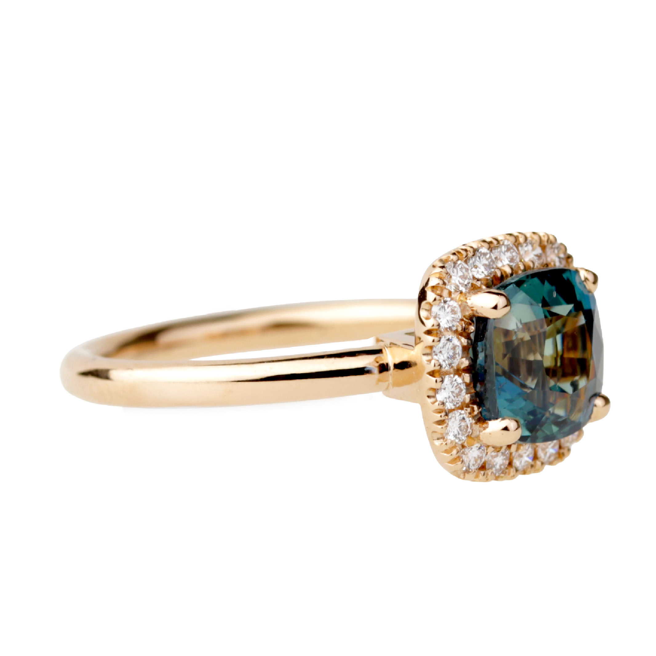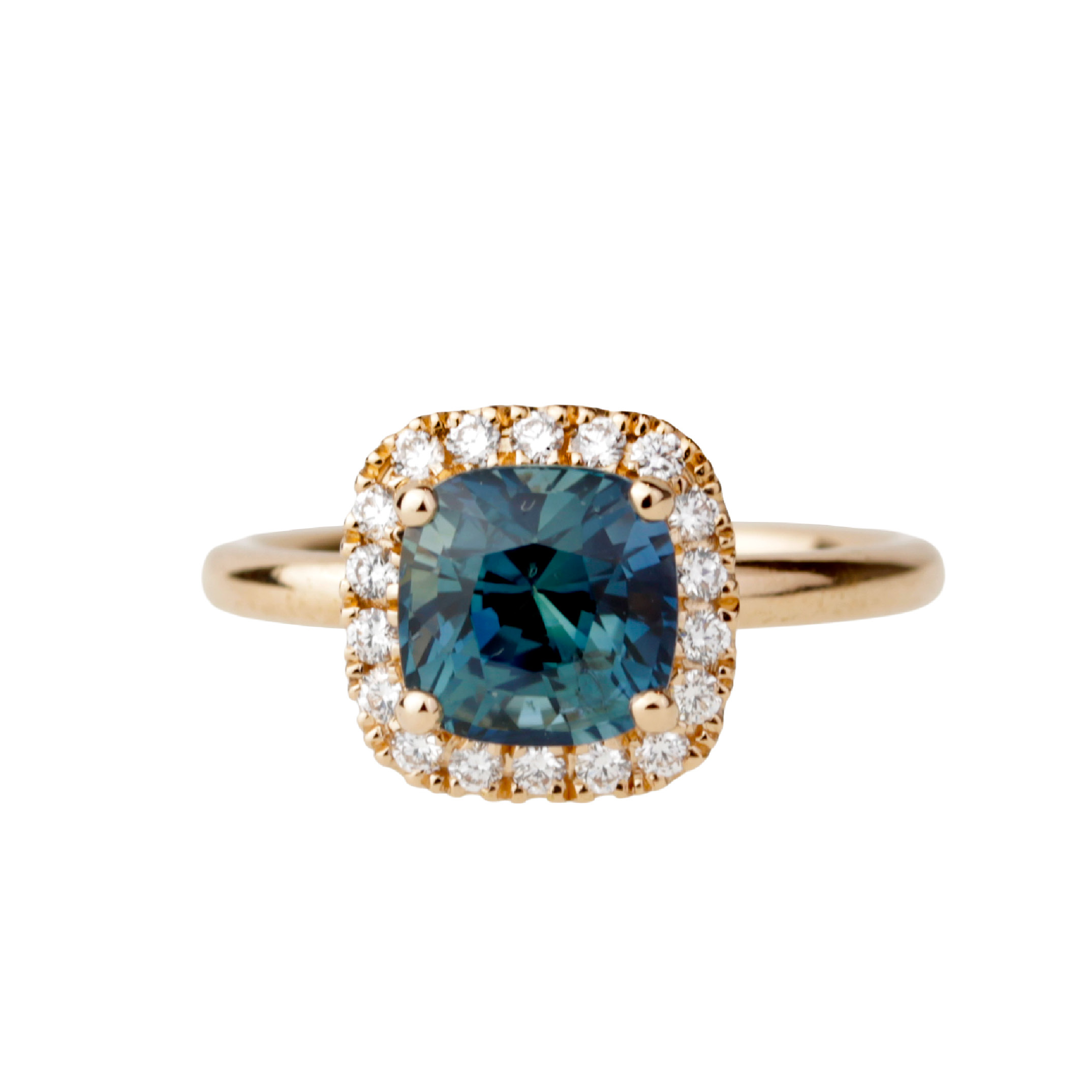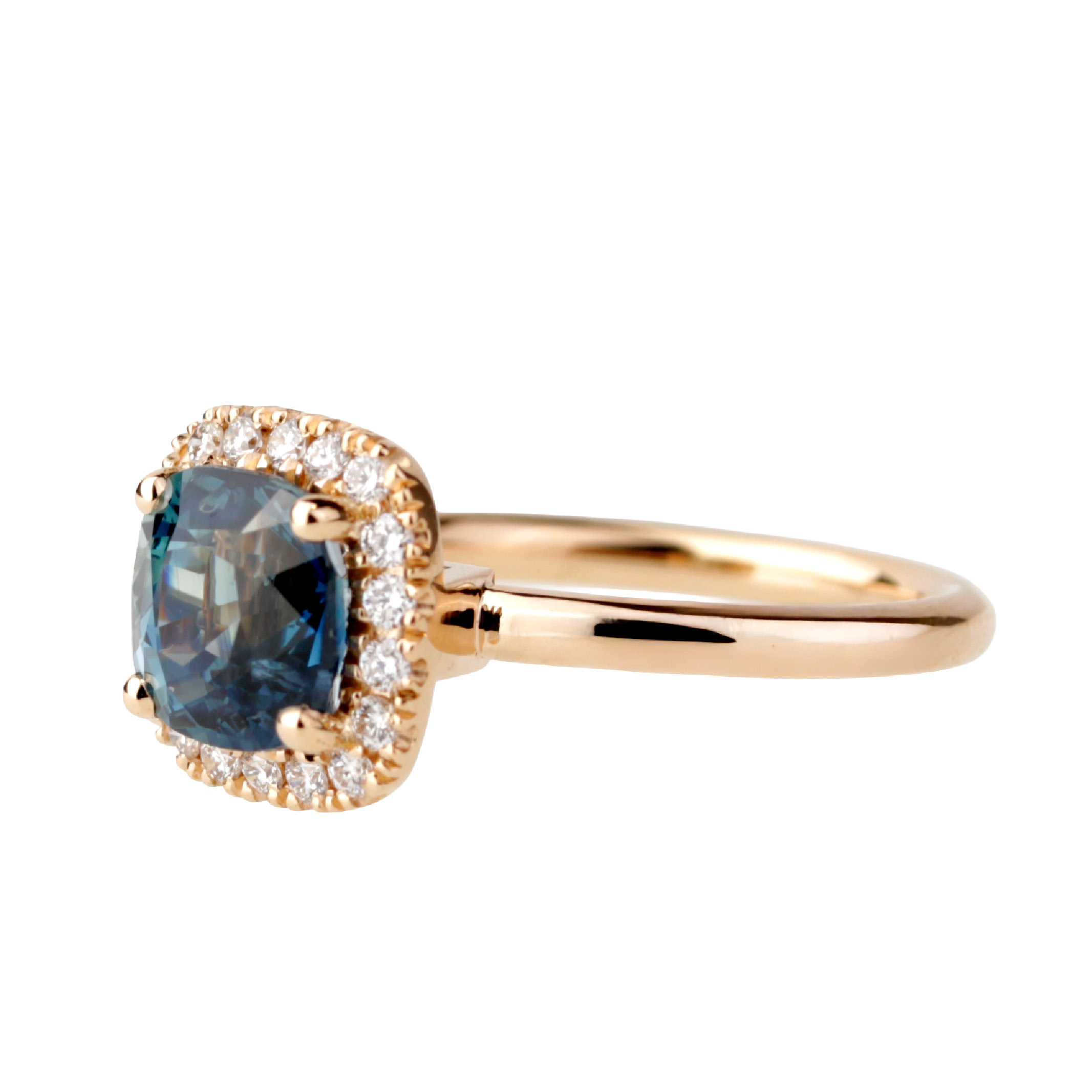 Taillé en coussin, le saphir est sublimé par un entourage de diamants délicatement sertis, qui intensifient son éclat tout en soulignant la douceur de sa forme. L’ensemble est monté sur un anneau en or rose 18 carats, dont la teinte chaleureuse crée un contraste élégant avec la fraîcheur du saphir.
