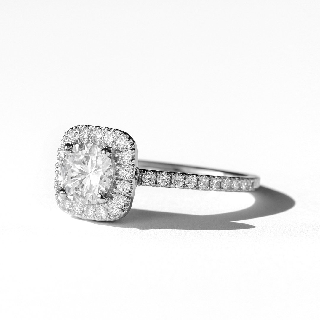 Dans la collection Antoinette, une version de la bague solitaire diamant réalisée en or blanc dans un entourage diamants de forme carré coussin. Icône de la maison pour sa légèreté et sa capacité à incarner pour beaucoup la bague de fiançailles idéale.