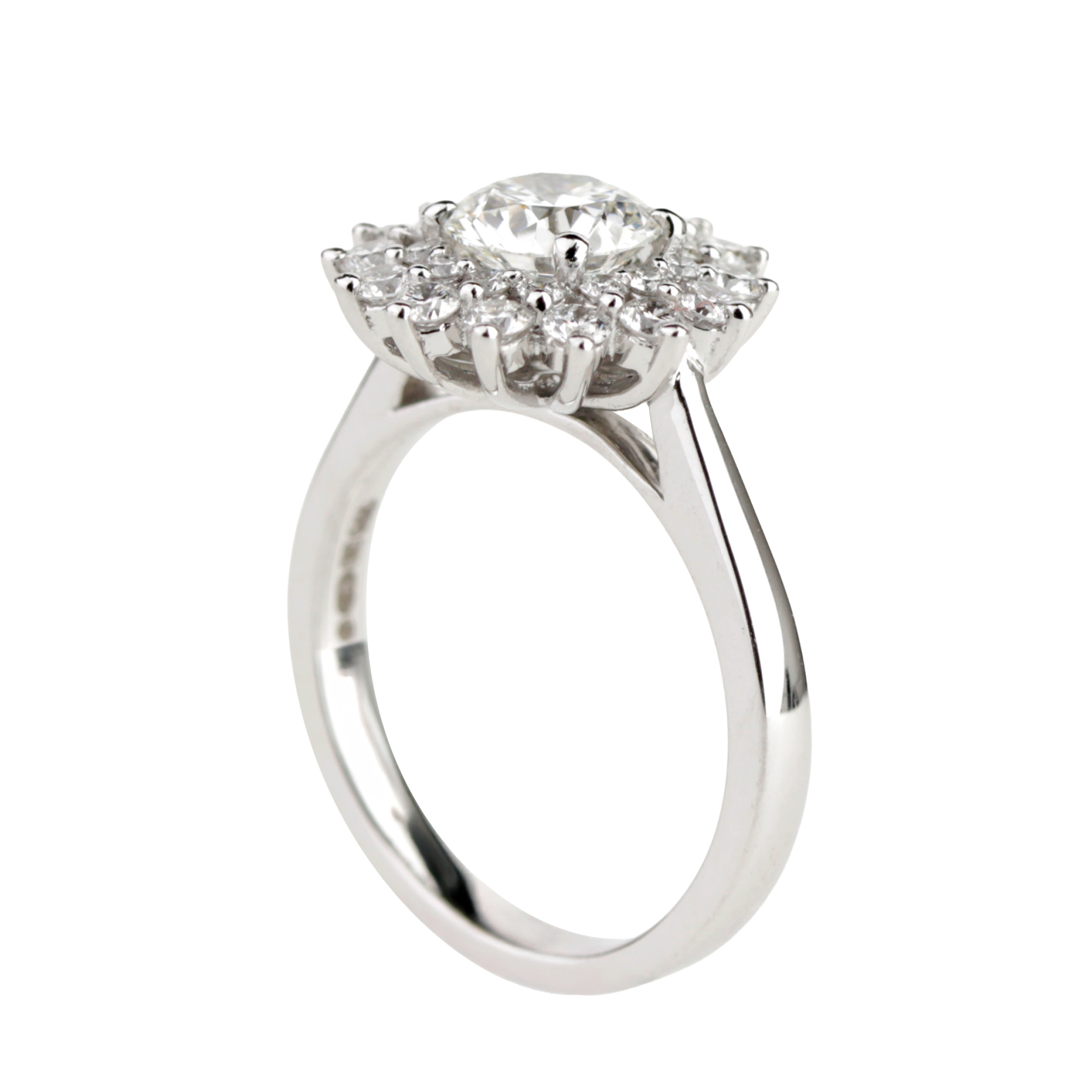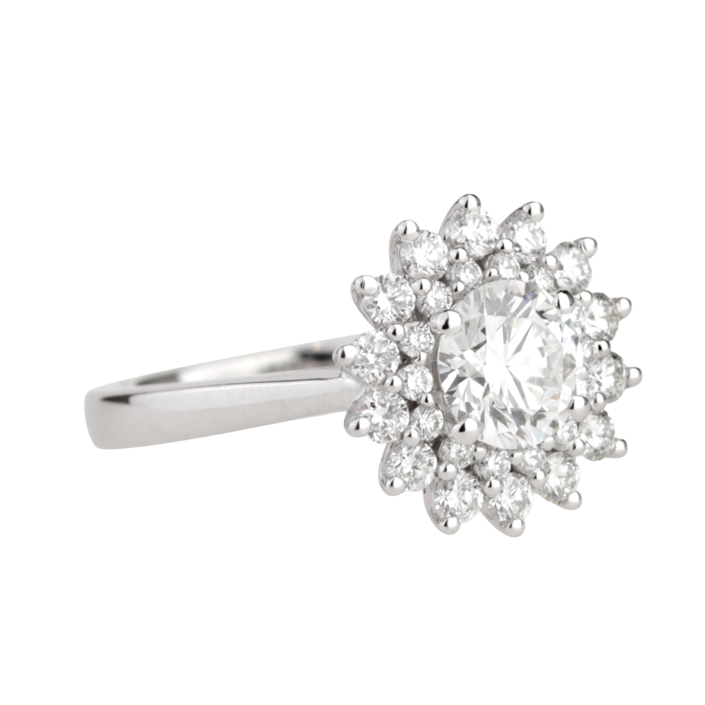 Le solitaire Aster met en scène un diamant central sublimé par un double entourage délicatement serti. Cette composition circulaire, parfaitement équilibrée, révèle un jeu de lumière intense et maîtrisé, où chaque pierre participe à l’éclat de l’ensemble.