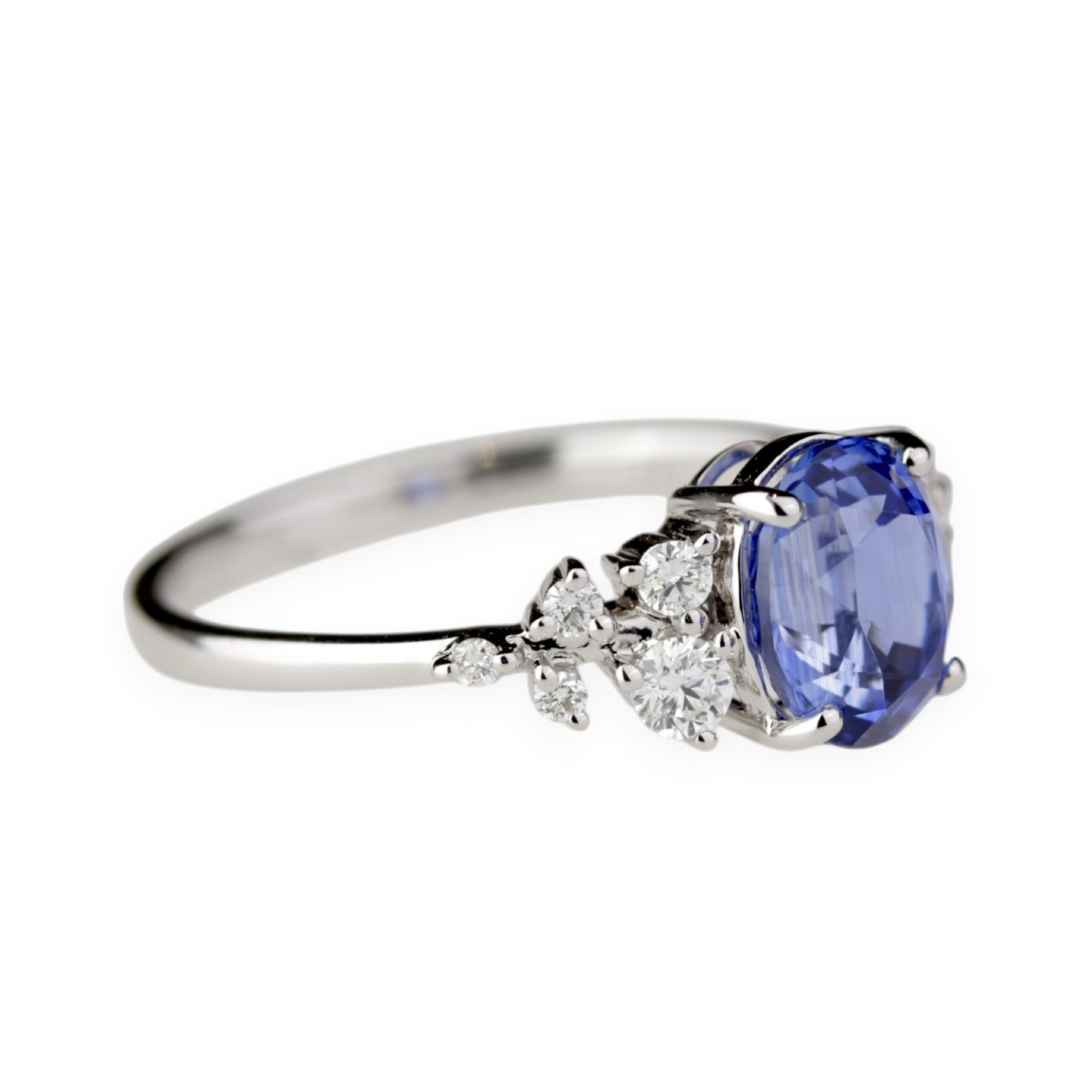 De part et d’autre, un jeu de diamants ronds compose une ligne aérienne évoquant la légèreté des ailes d’un papillon. Leur disposition asymétrique apporte rythme et finesse à l’ensemble, tout en soulignant l’éclat du saphir central.