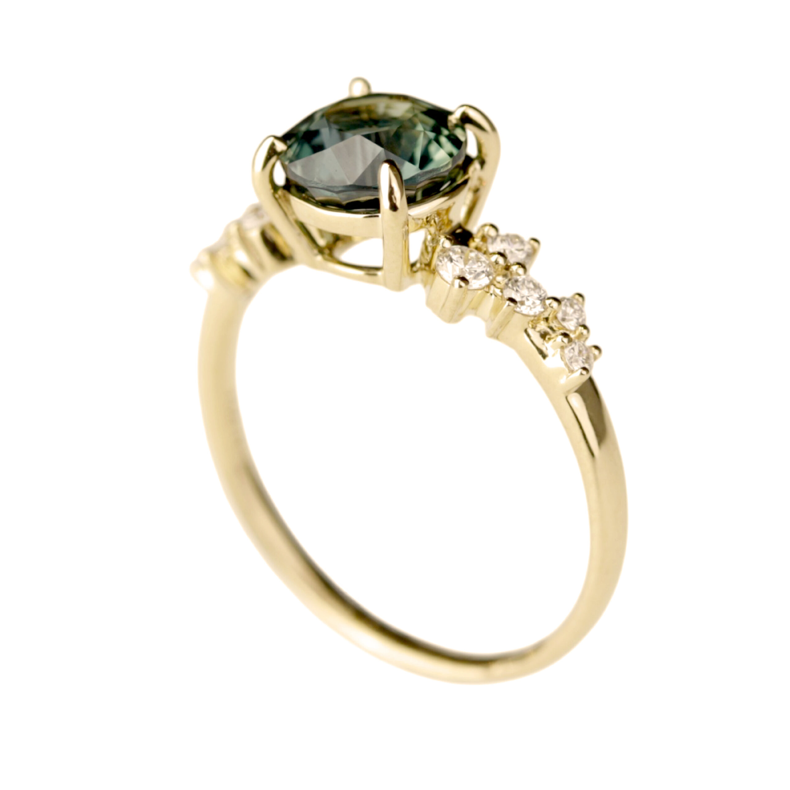 De part et d’autre, un jeu de diamants ronds compose une ligne aérienne évoquant la légèreté des ailes d’un papillon. Leur disposition asymétrique apporte rythme et finesse à l’ensemble, tout en soulignant l’éclat du saphir central.