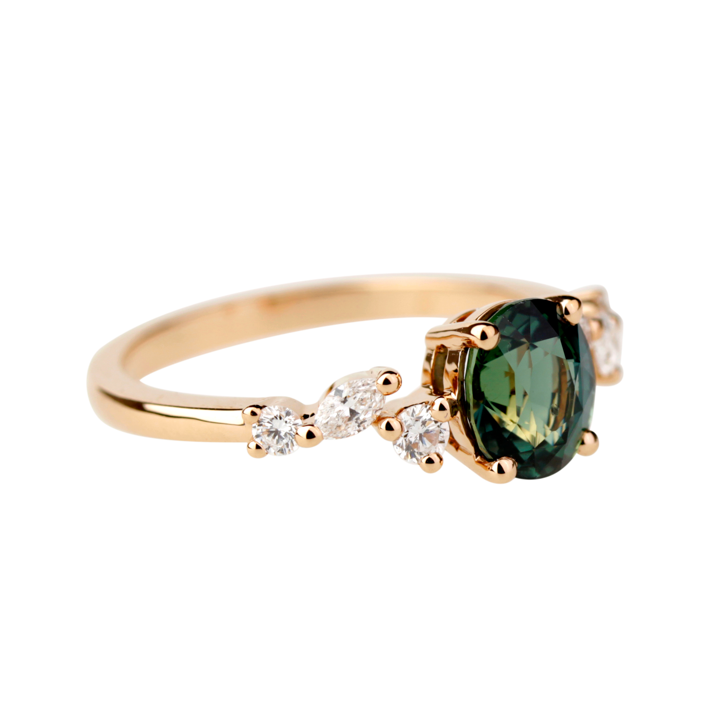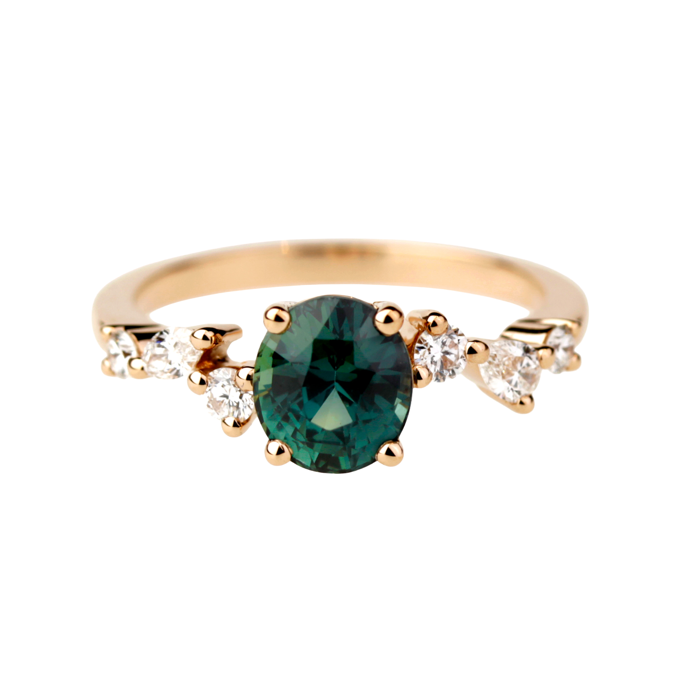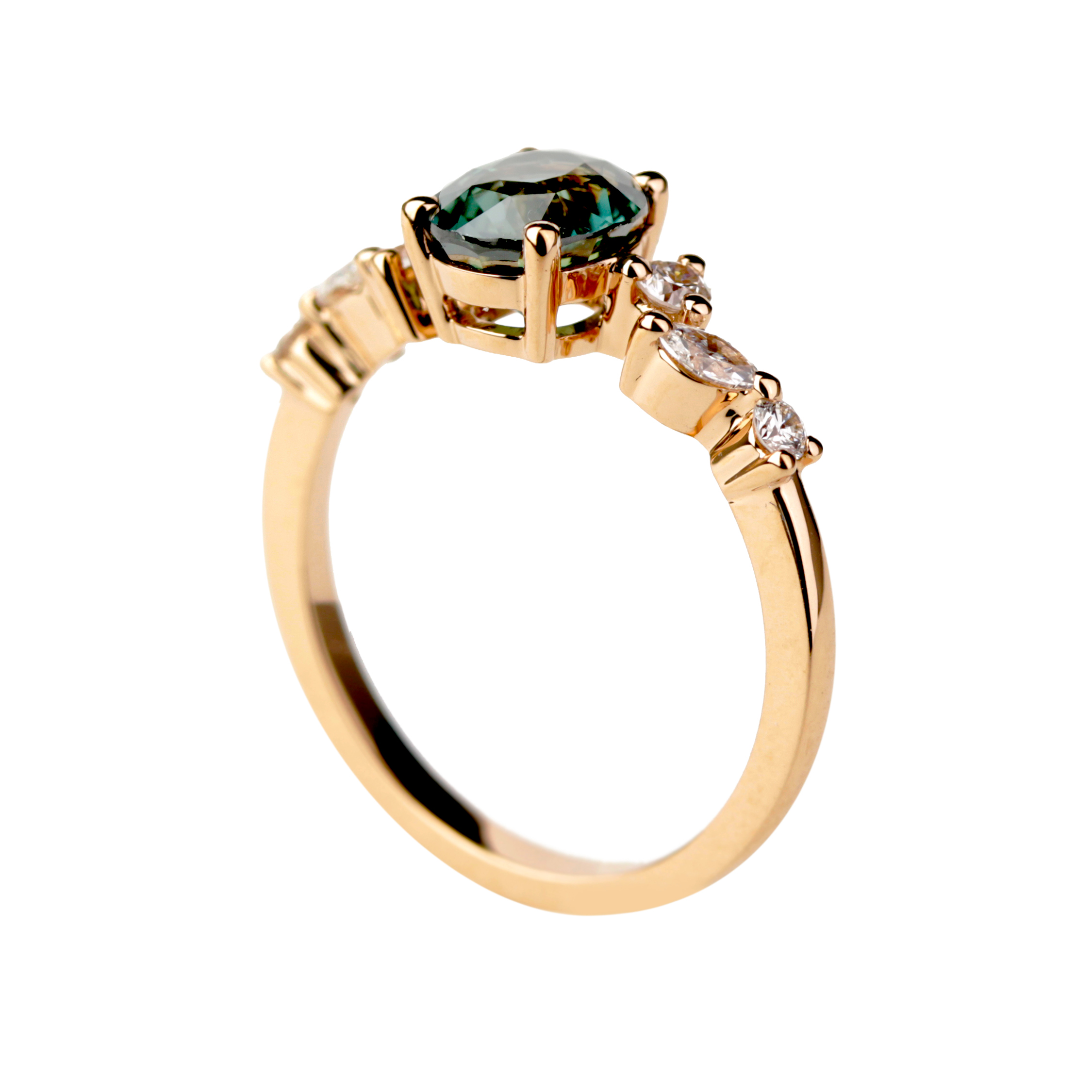 De part et d’autre, un jeu de diamants compose une ligne aérienne évoquant la légèreté des ailes d’un papillon. Leur disposition asymétrique apporte rythme et finesse à l’ensemble, tout en soulignant l’éclat du saphir central.