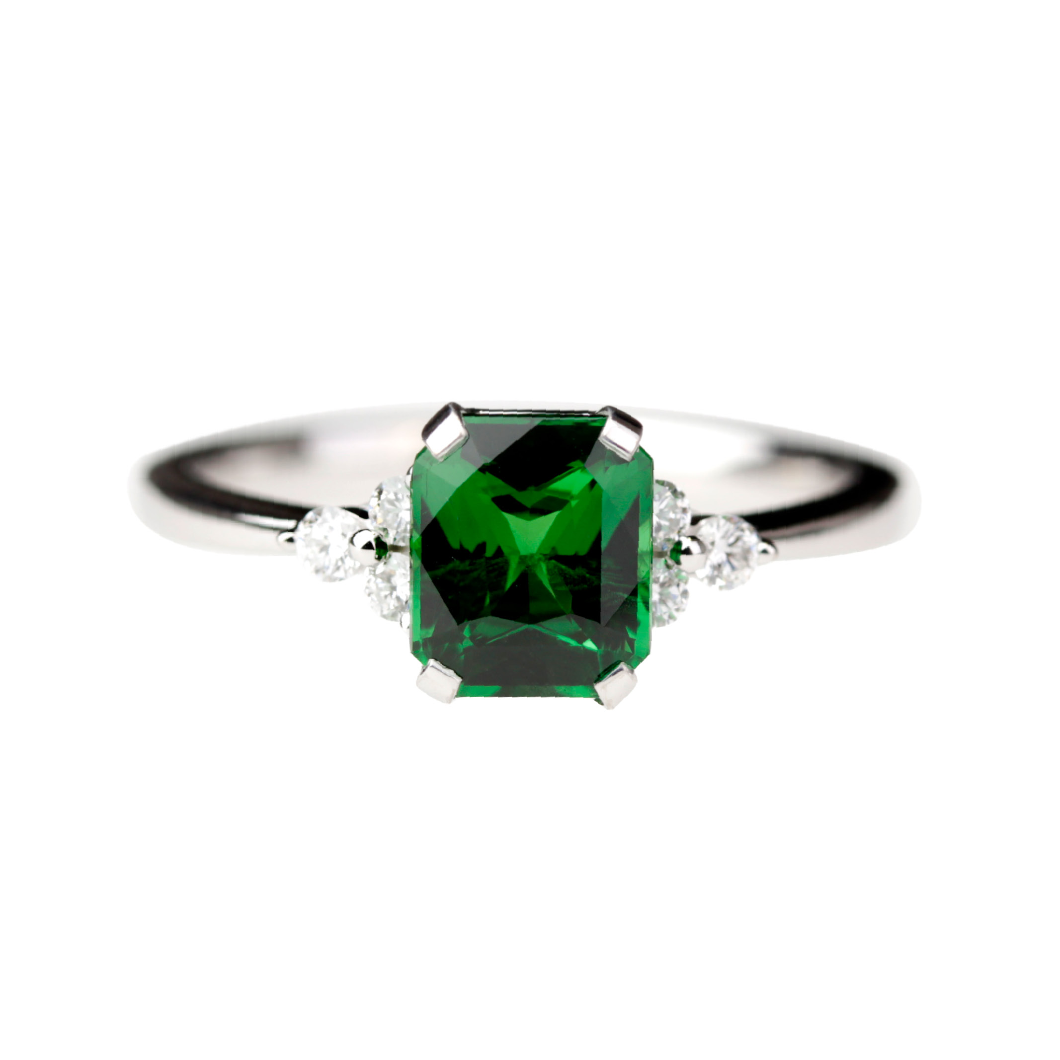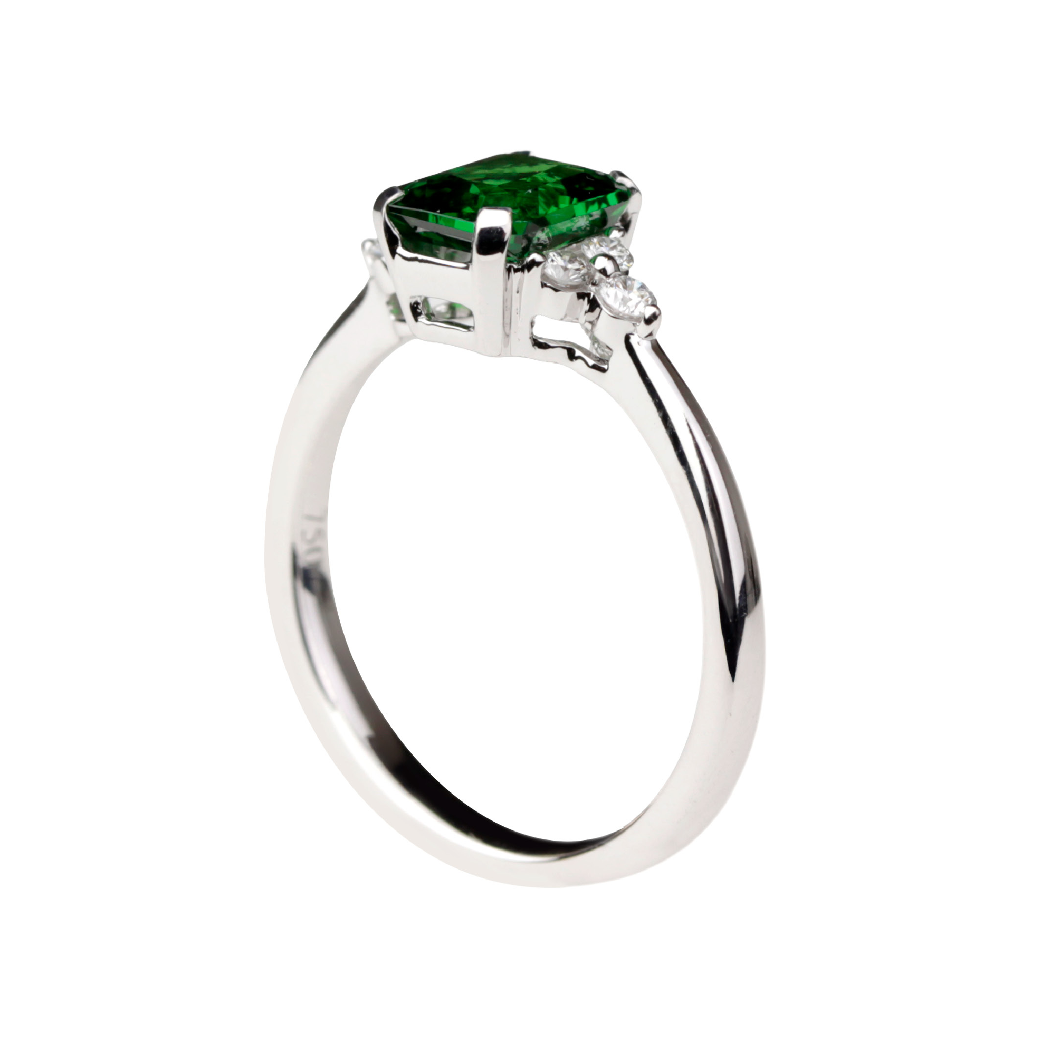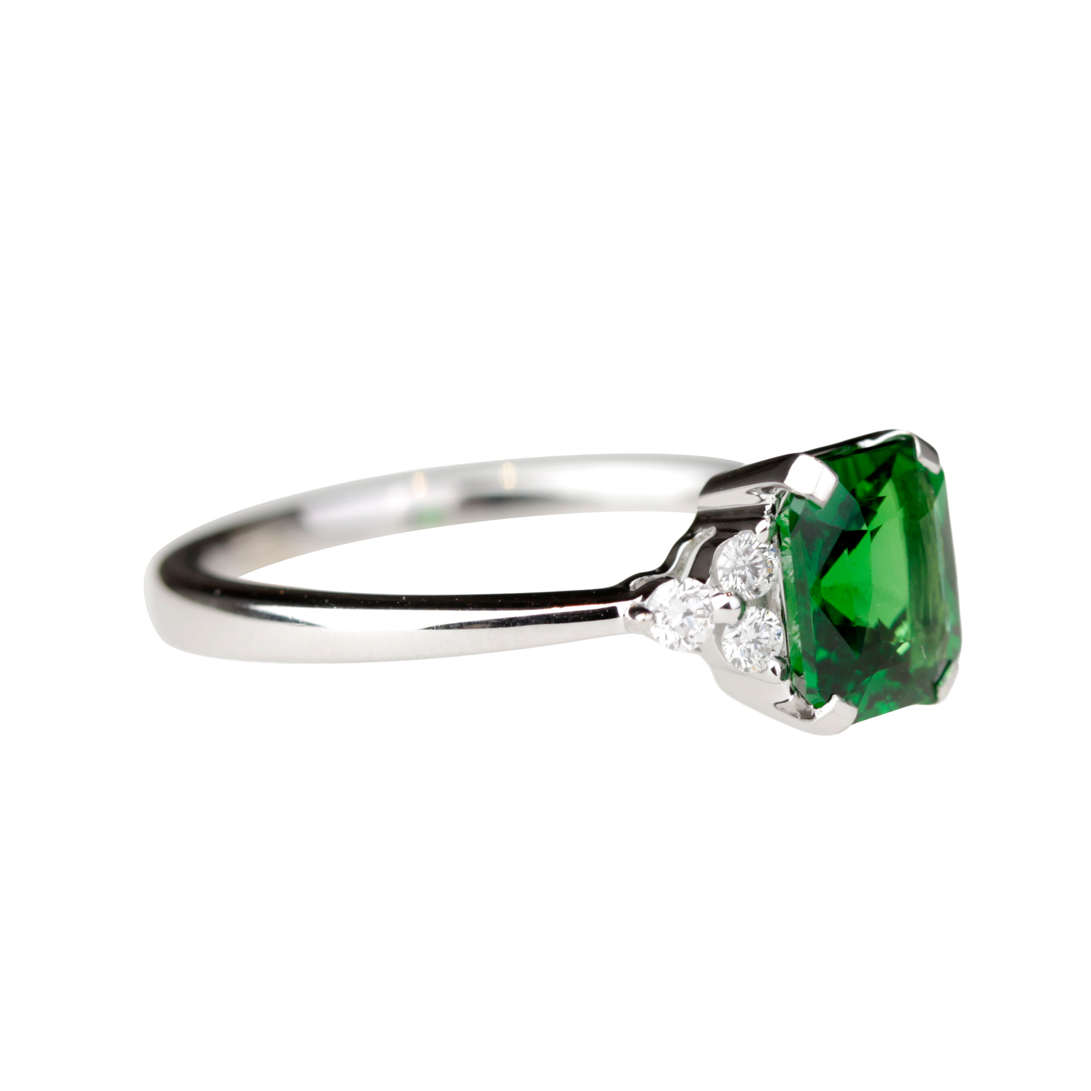 Taillé en forme carrée à pans coupés, le tsavorite est sublimé par un serti griffes en or blanc 18K, qui laisse la pierre capter pleinement la lumière. De part et d’autre, de fins diamants délicatement sertis viennent souligner la gemme centrale et apportent une touche de brillance subtile, sans jamais détourner le regard de la pierre principale.