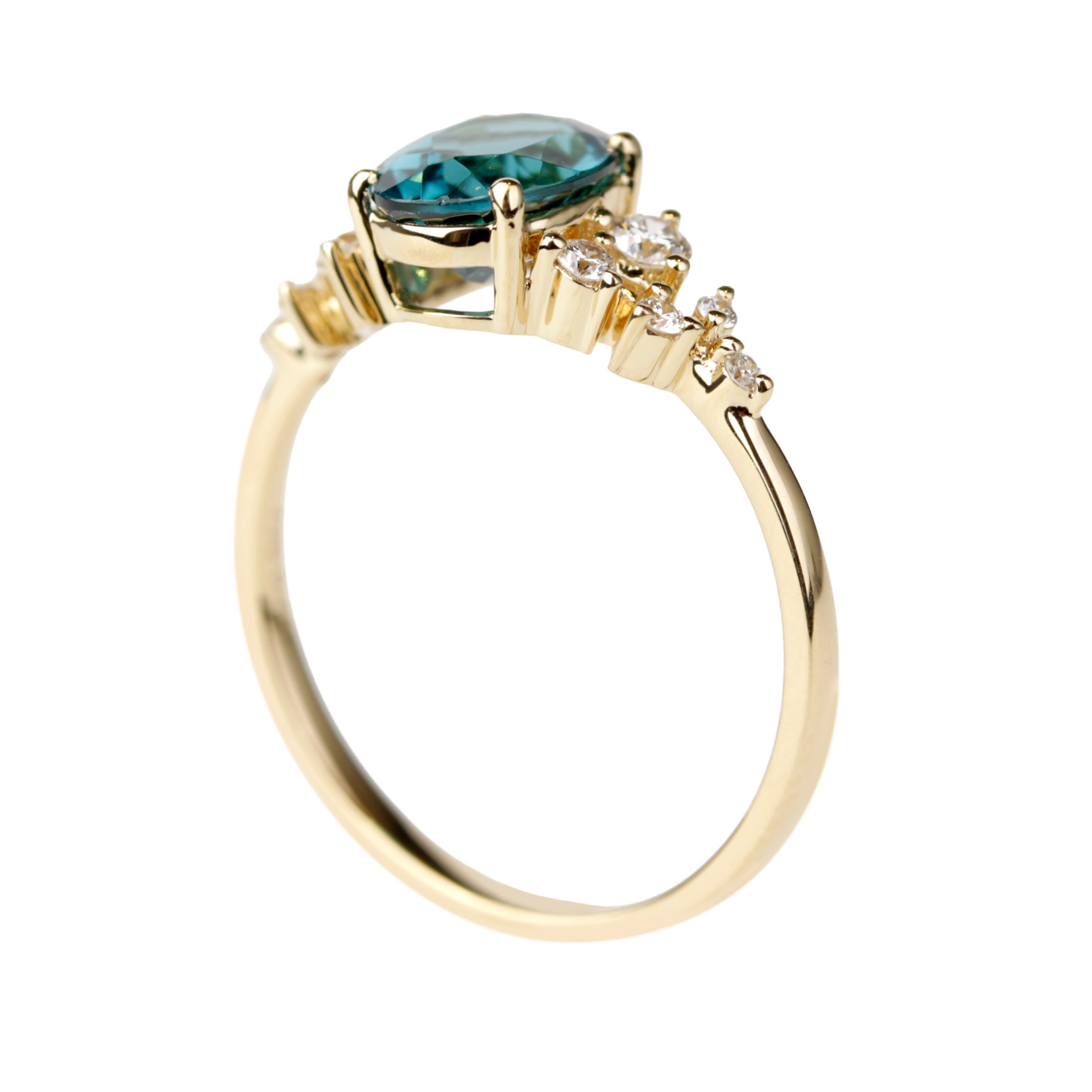 De part et d’autre, de fins diamants viennent souligner la tourmaline dans un jeu d’équilibre et de délicatesse. Leur éclat apporte une touche de lumière discrète, mettant en valeur la pierre centrale sans jamais la supplanter. L’ensemble est monté sur un anneau en or jaune 18K, aux lignes fines et harmonieuses, qui confère à la bague une allure à la fois précieuse et intemporelle.