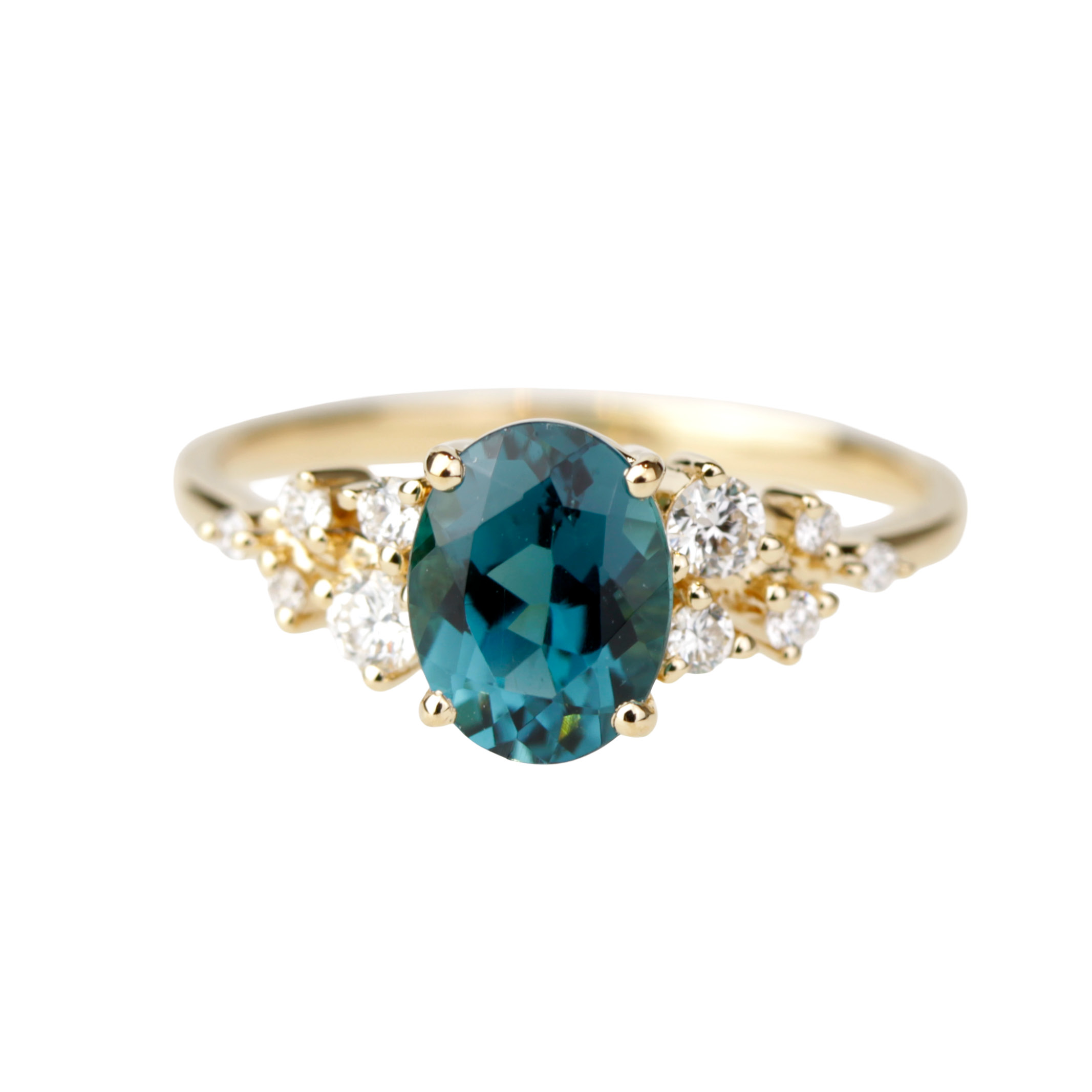 La bague Dubarry met en lumière une tourmaline indigo à la couleur profonde subtilement nuancée de reflets bleutés et verts. Taillée en ovale, la pierre centrale révèle toute sa profondeur grâce à une taille pensée pour capter la lumière avec intensité et élégance.