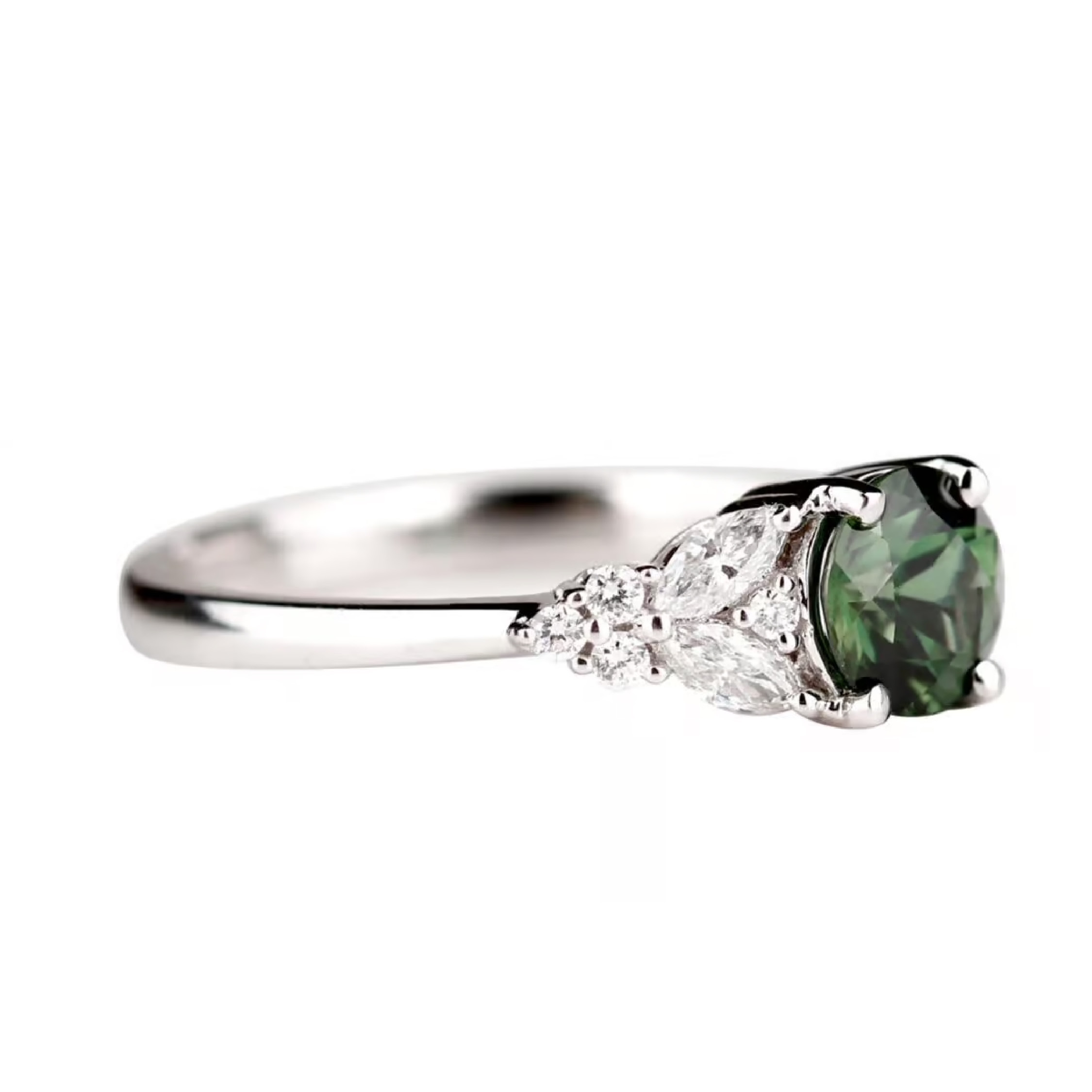 | Poids Pierre | Saphir vert: 0, 79 carat; 12 diamants taille navette et brillant pour 0, 27 carat |
