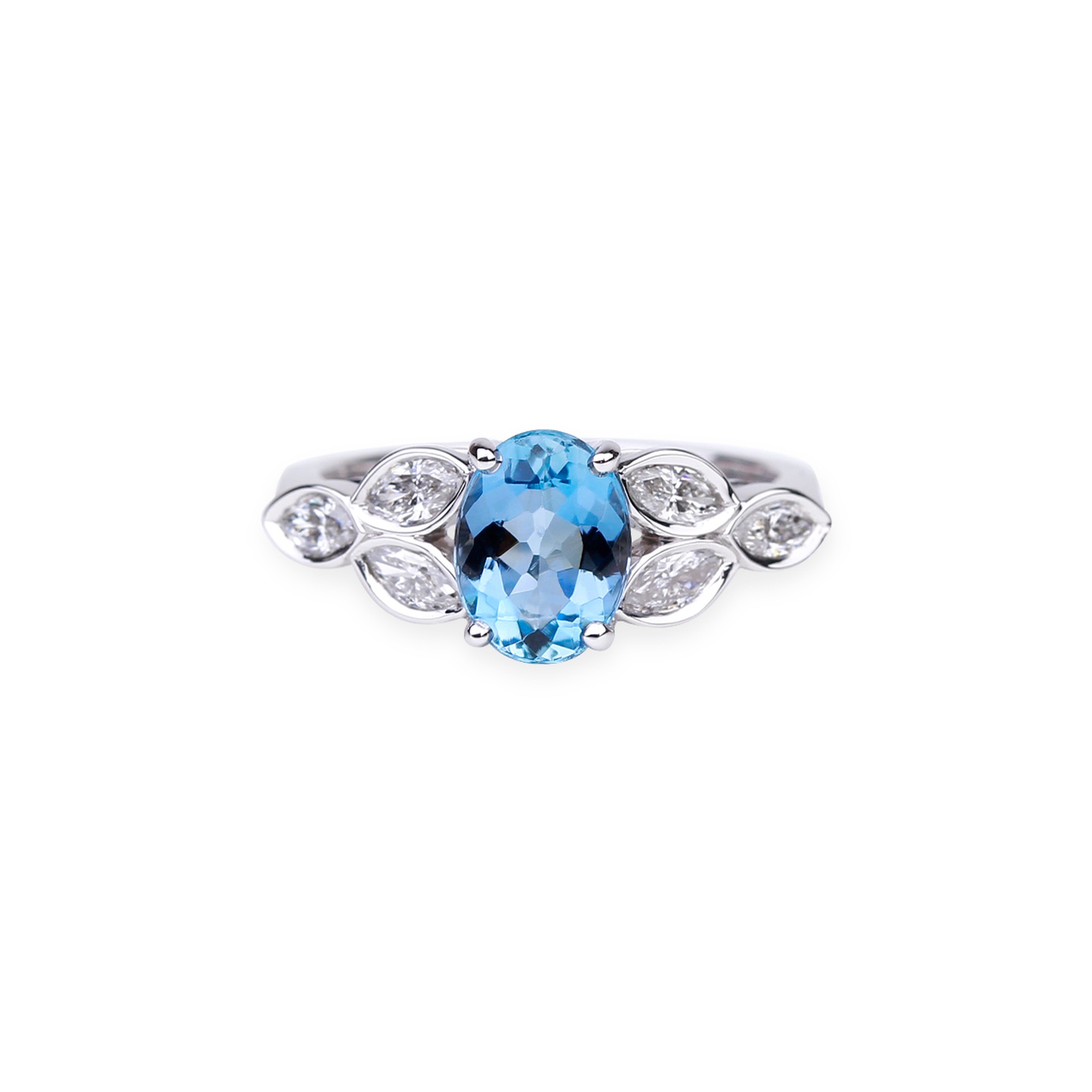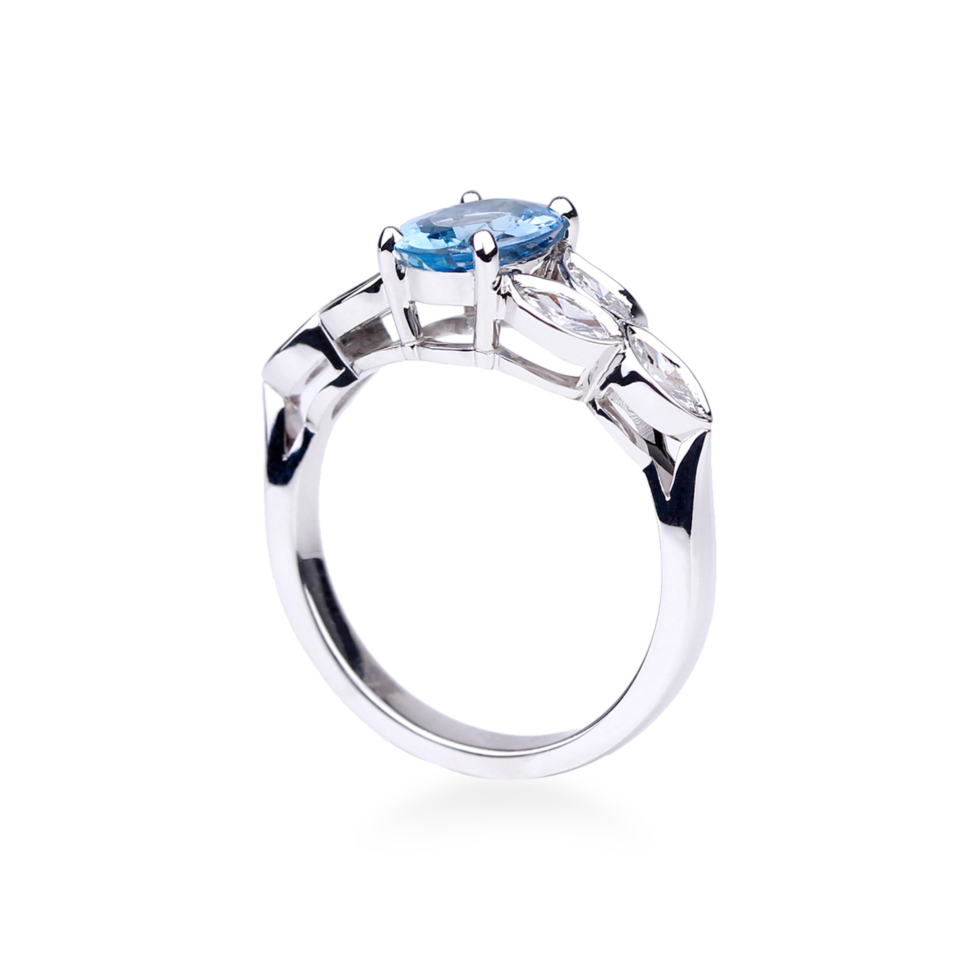 Aigue-marine: 1, 01 carats; diamants navette: 0, 46 carat