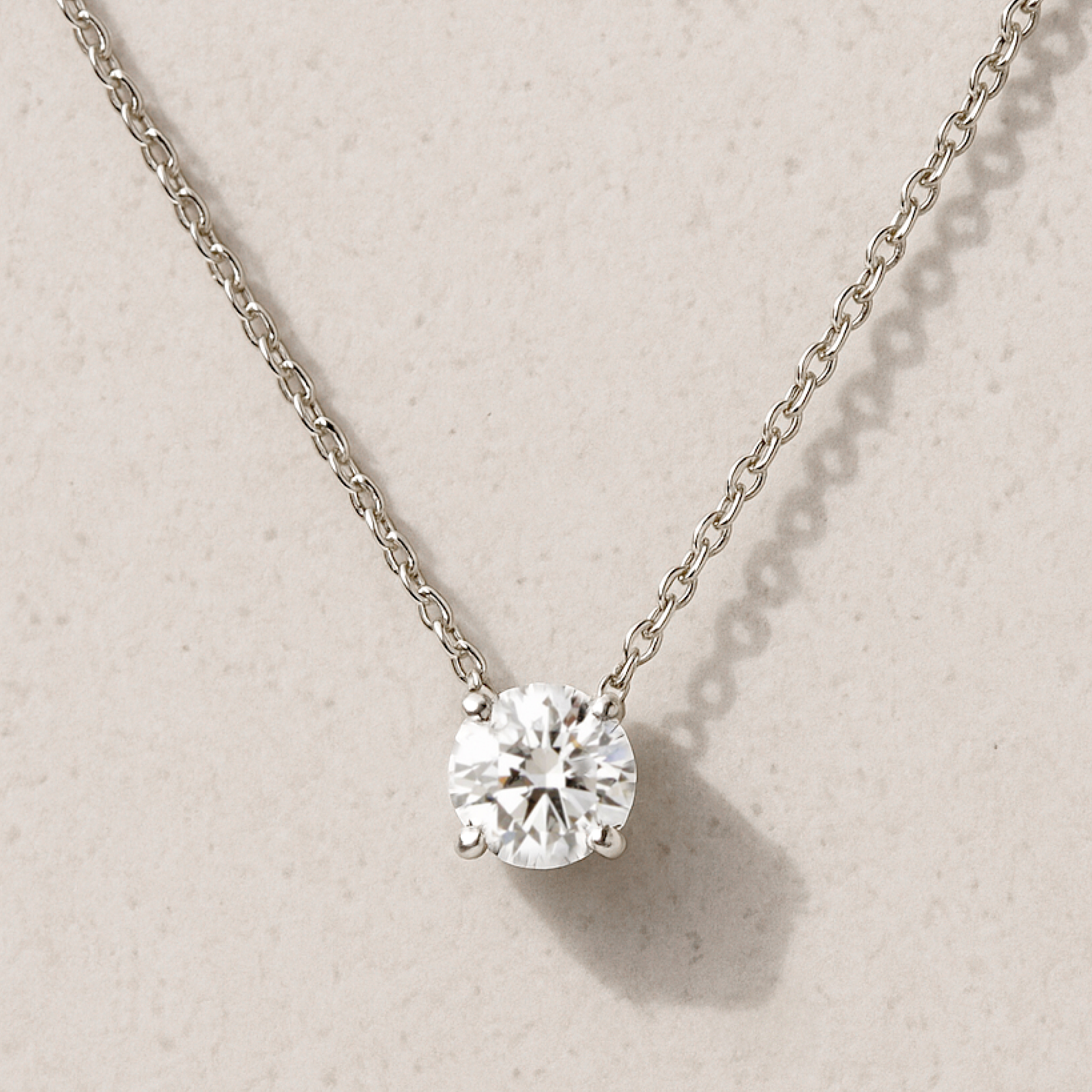 Un pendentif lumineux et épuré, serti d’un diamant de culture d’un carat, couleur D, pureté VVS 1, monté sur un panier à quatre griffes, suspendu à une fine chaîne en or 18 K.