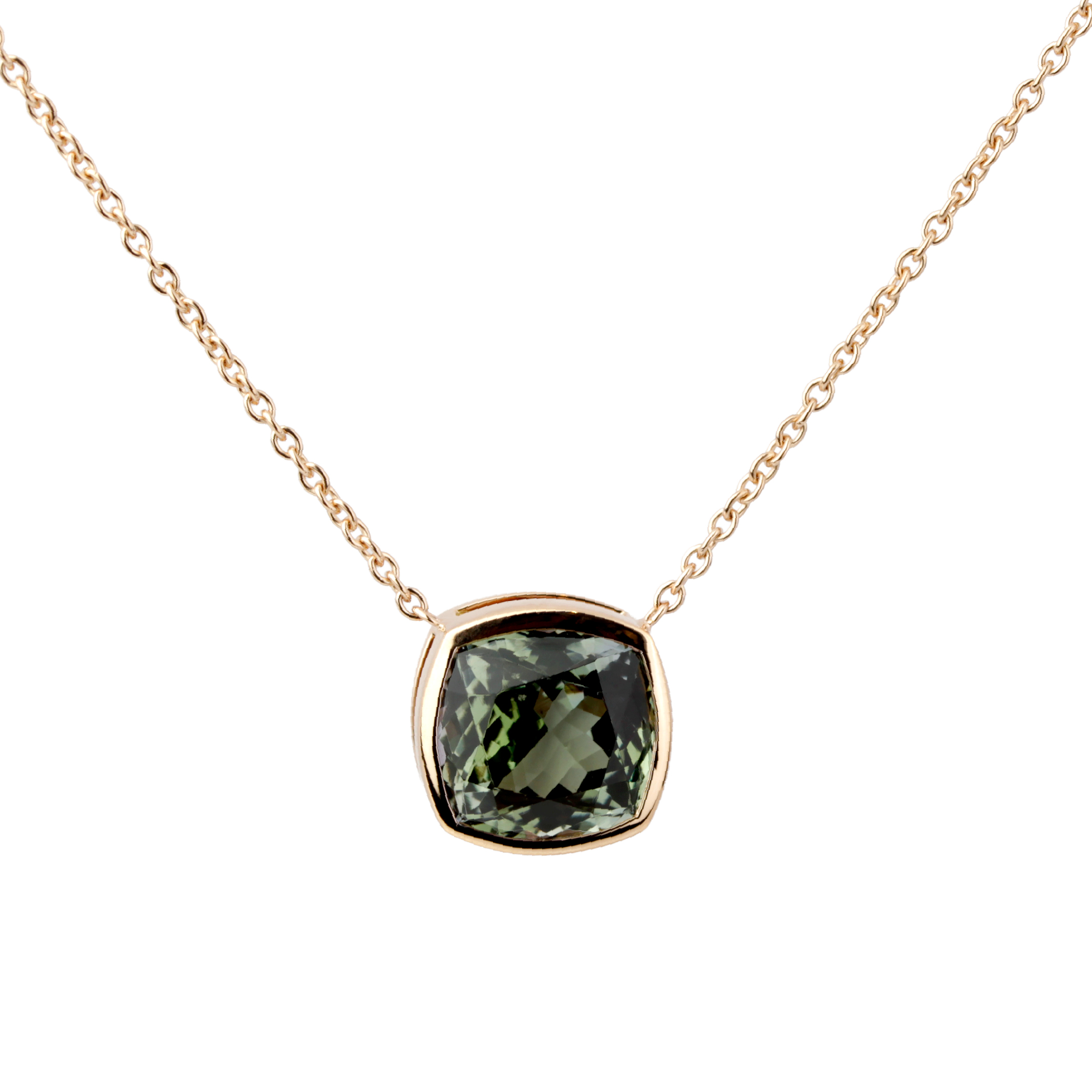 Sertissure sur panier clos pour donner du volume au pendentif tanzanite verte naturelle or rose et permettre à la chaîne de passer directement dans la structure sans avoir recours à une bélière.