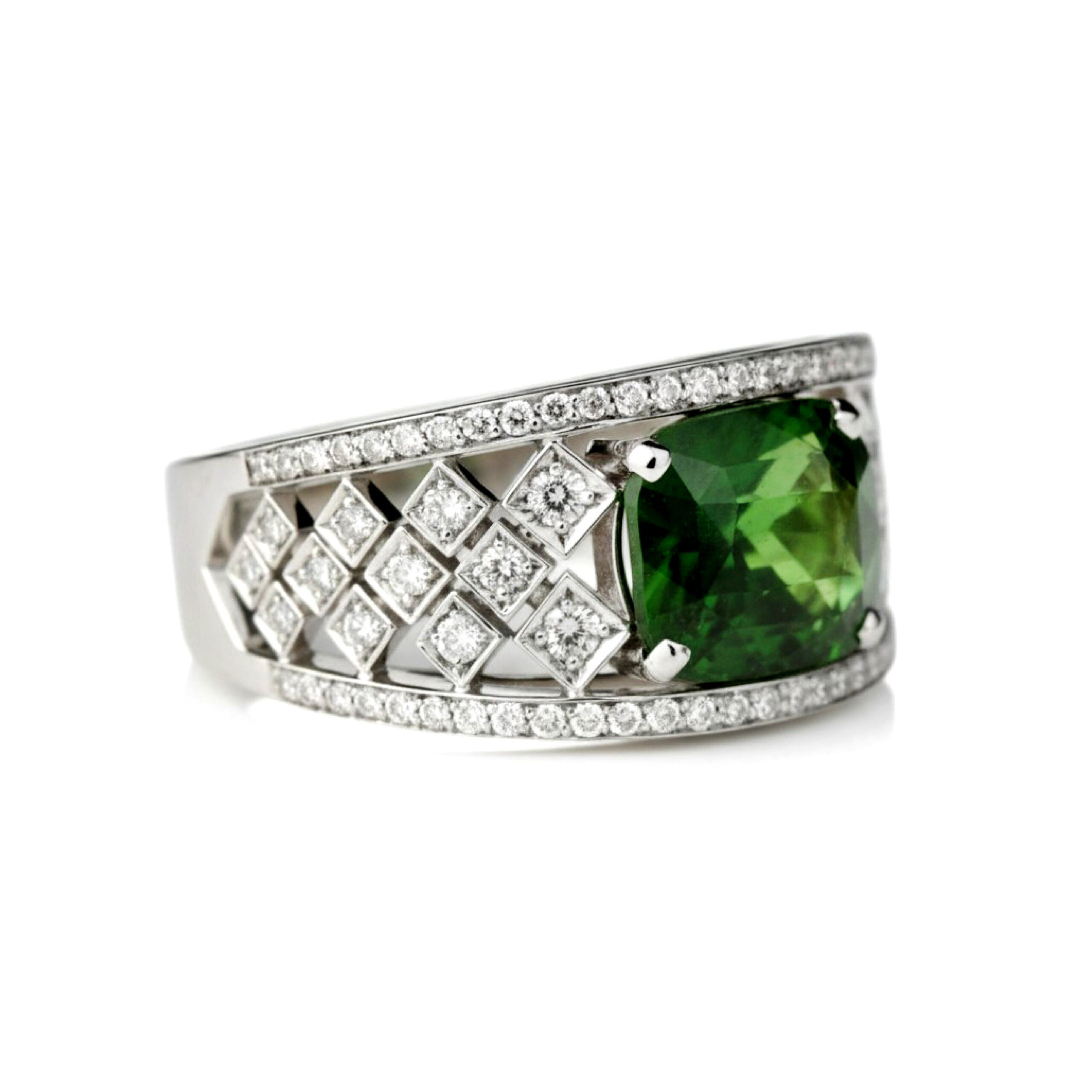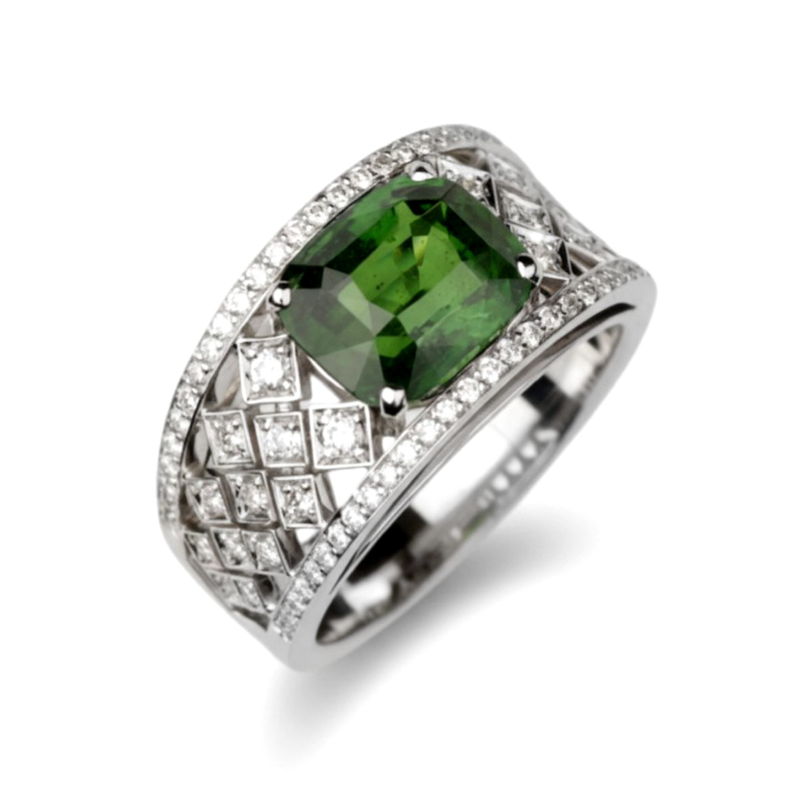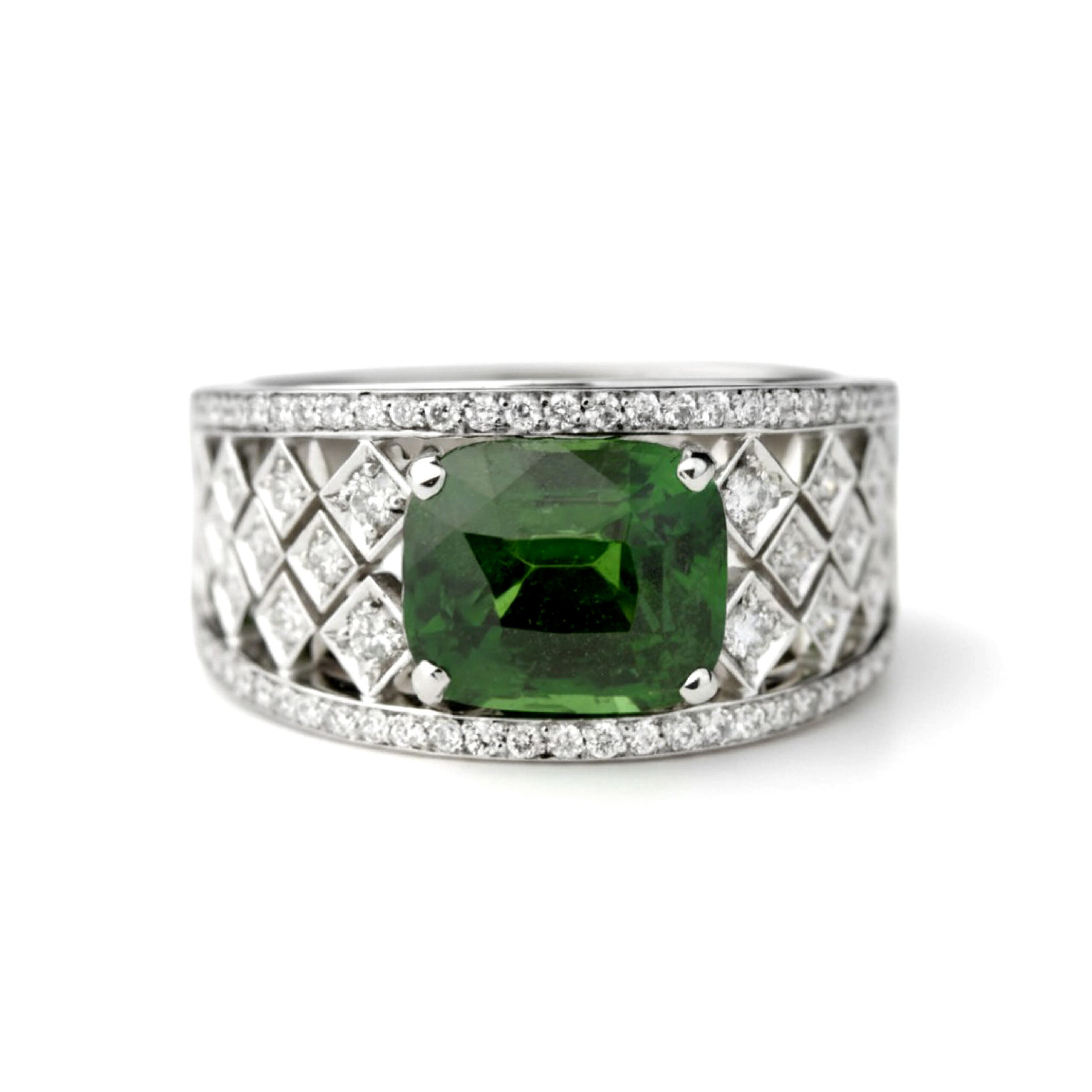Serti entre deux brins d’or blanc 18K habillés de diamants, le grenat tsavorite resplendit au milieu d’un accompagnement de 84 petits diamants.