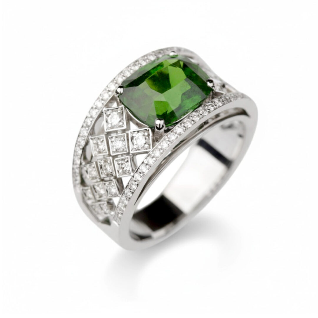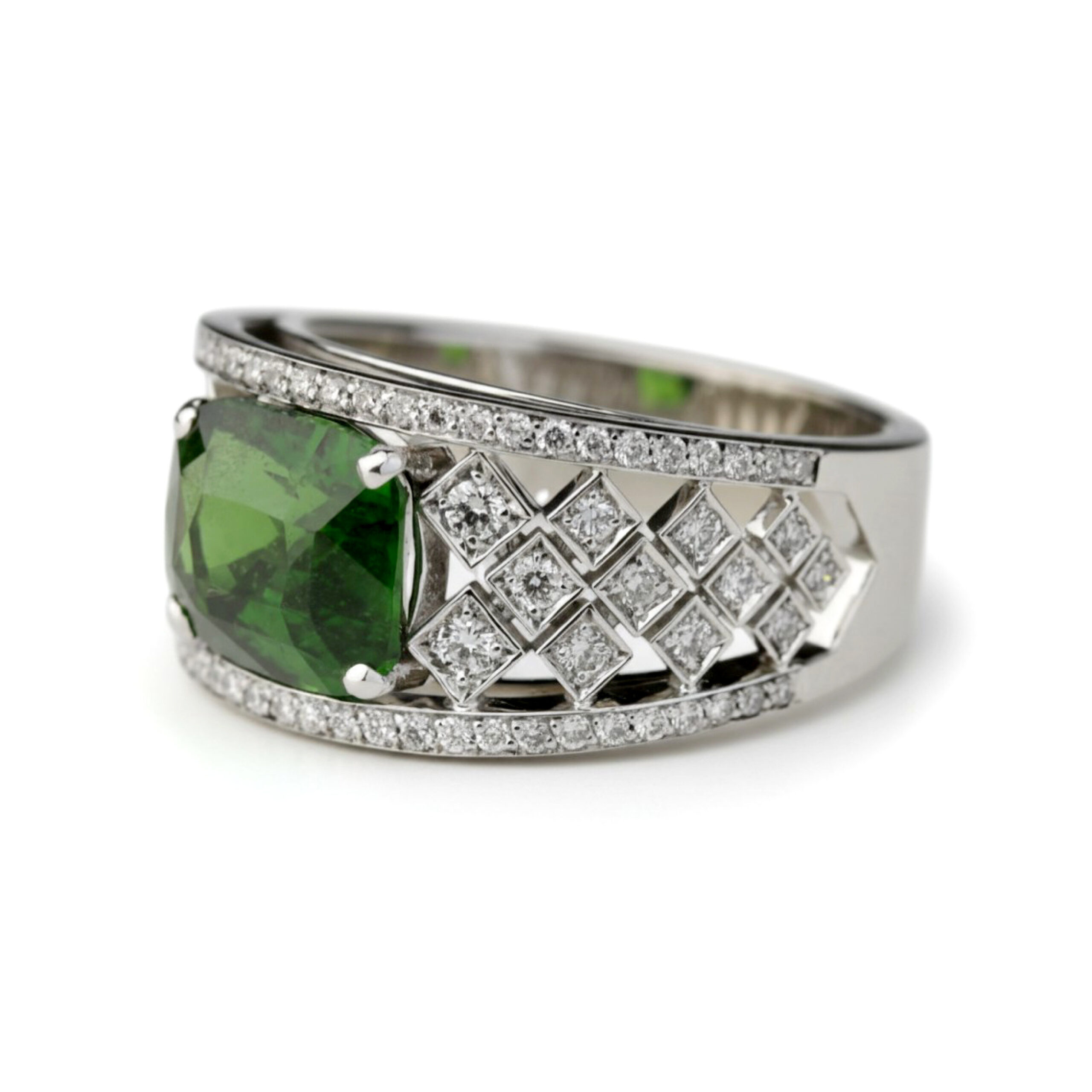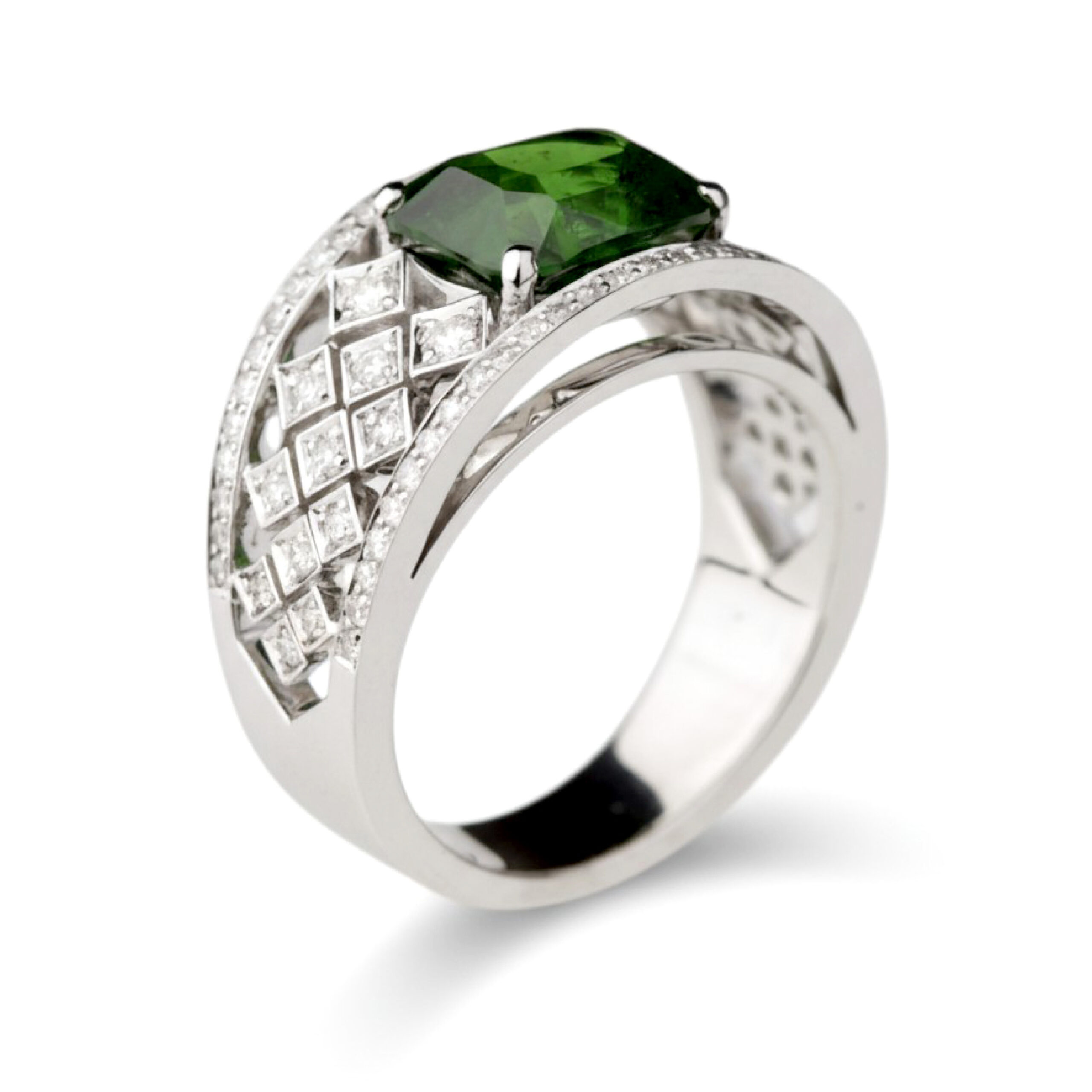 Serti entre deux brins d’or blanc 18K habillés de diamants, le grenat tsavorite resplendit au milieu d’un accompagnement de 84 petits diamants.